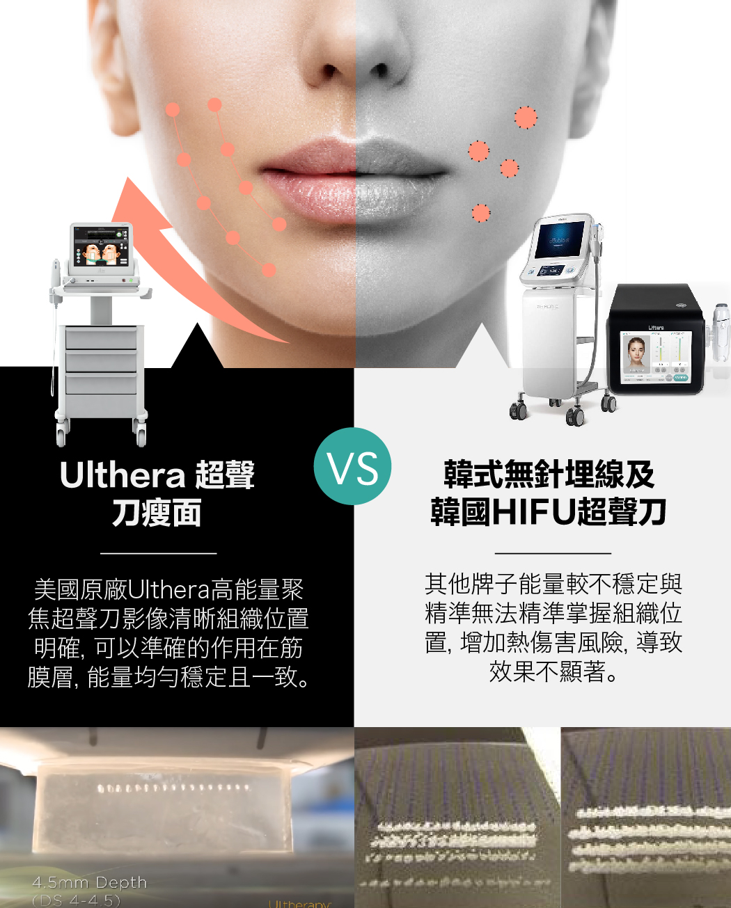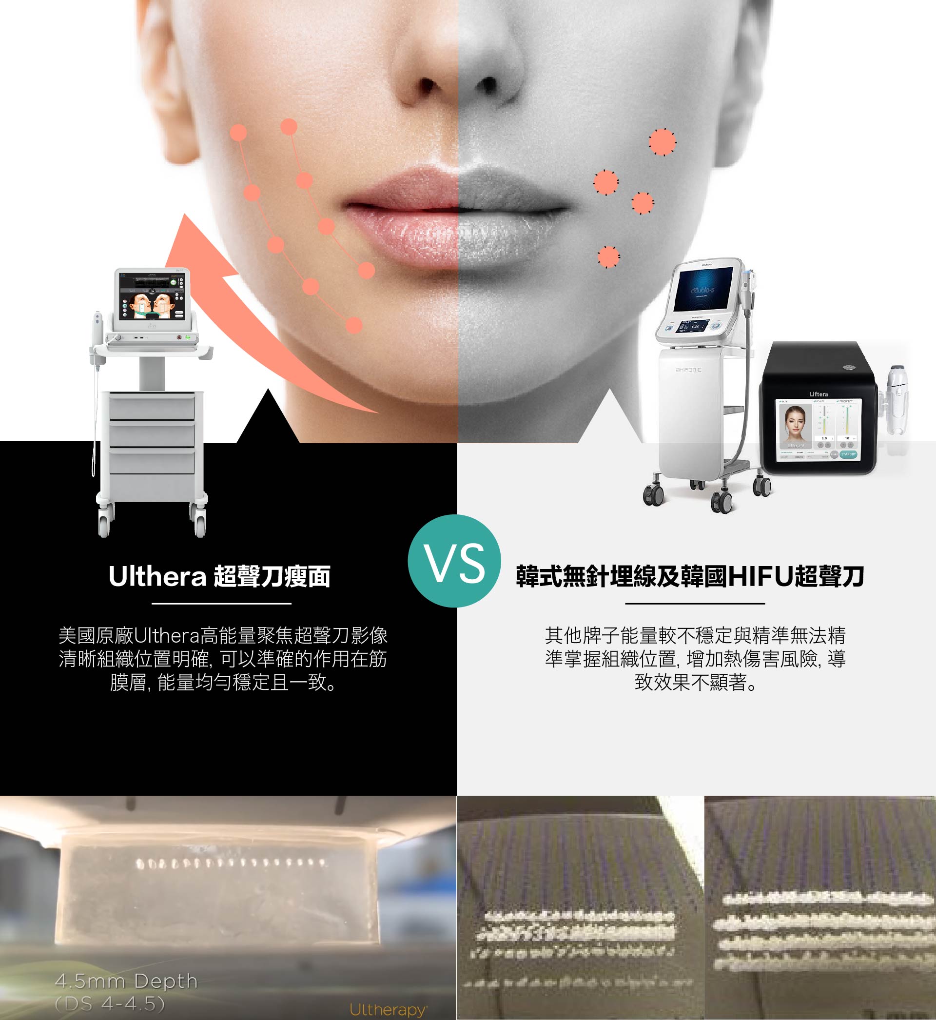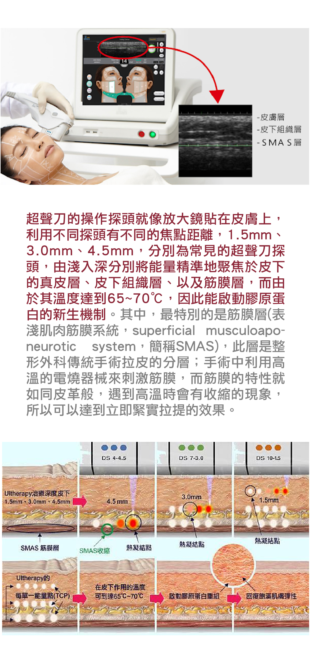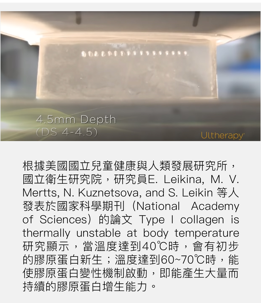 4.精準的深度與溫度是緊緻拉提治療的重大關鍵:美國原廠Ulthera® 高能量聚焦超聲刀能為您精確的控制這兩項治療關鍵。