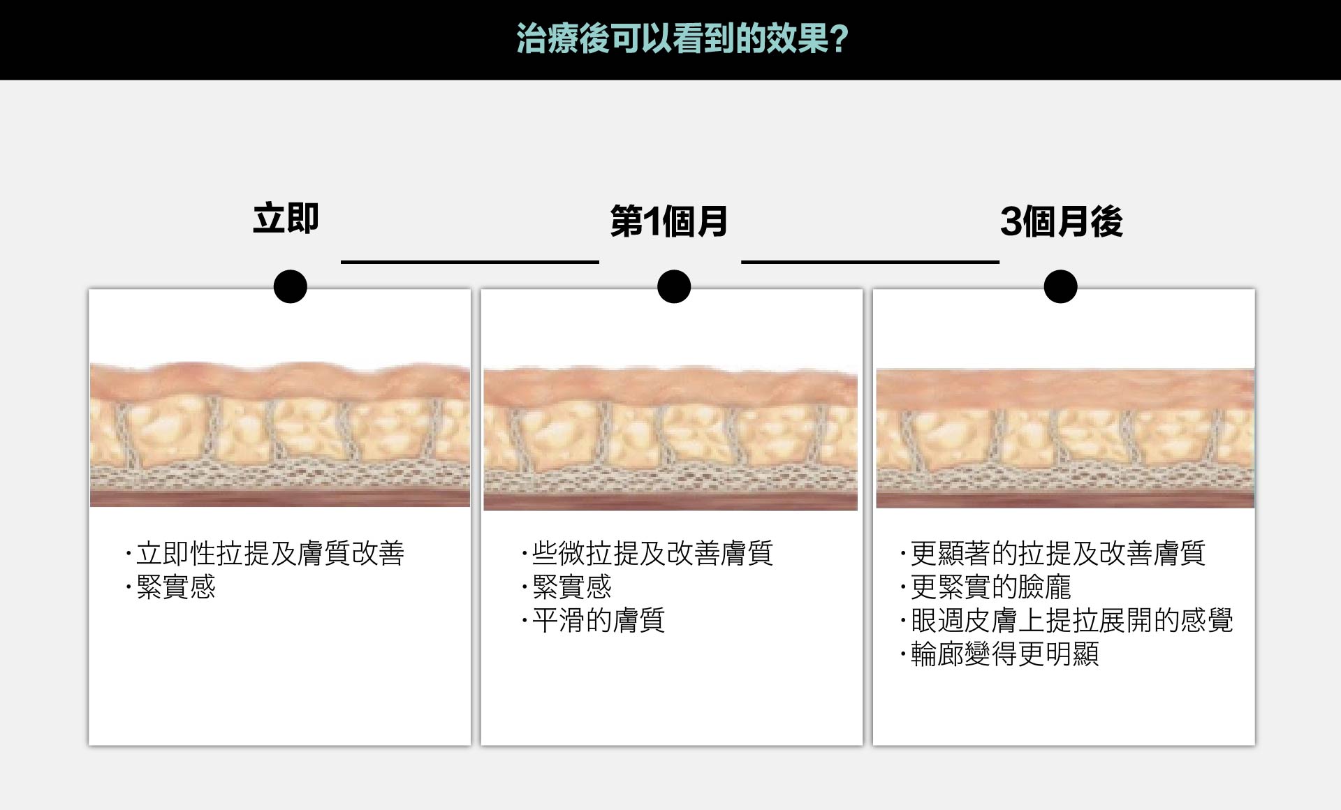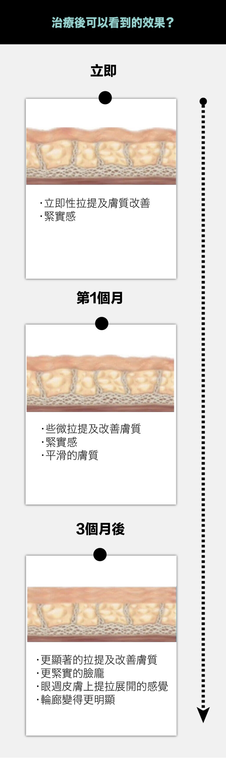 第二是因組織受熱後膠原蛋白長期新生重組後會產生持久性拉提緊緻的效果。最佳治療效果會出現在3-6個月。