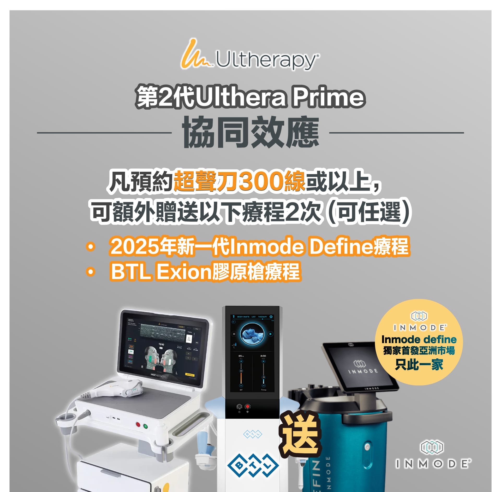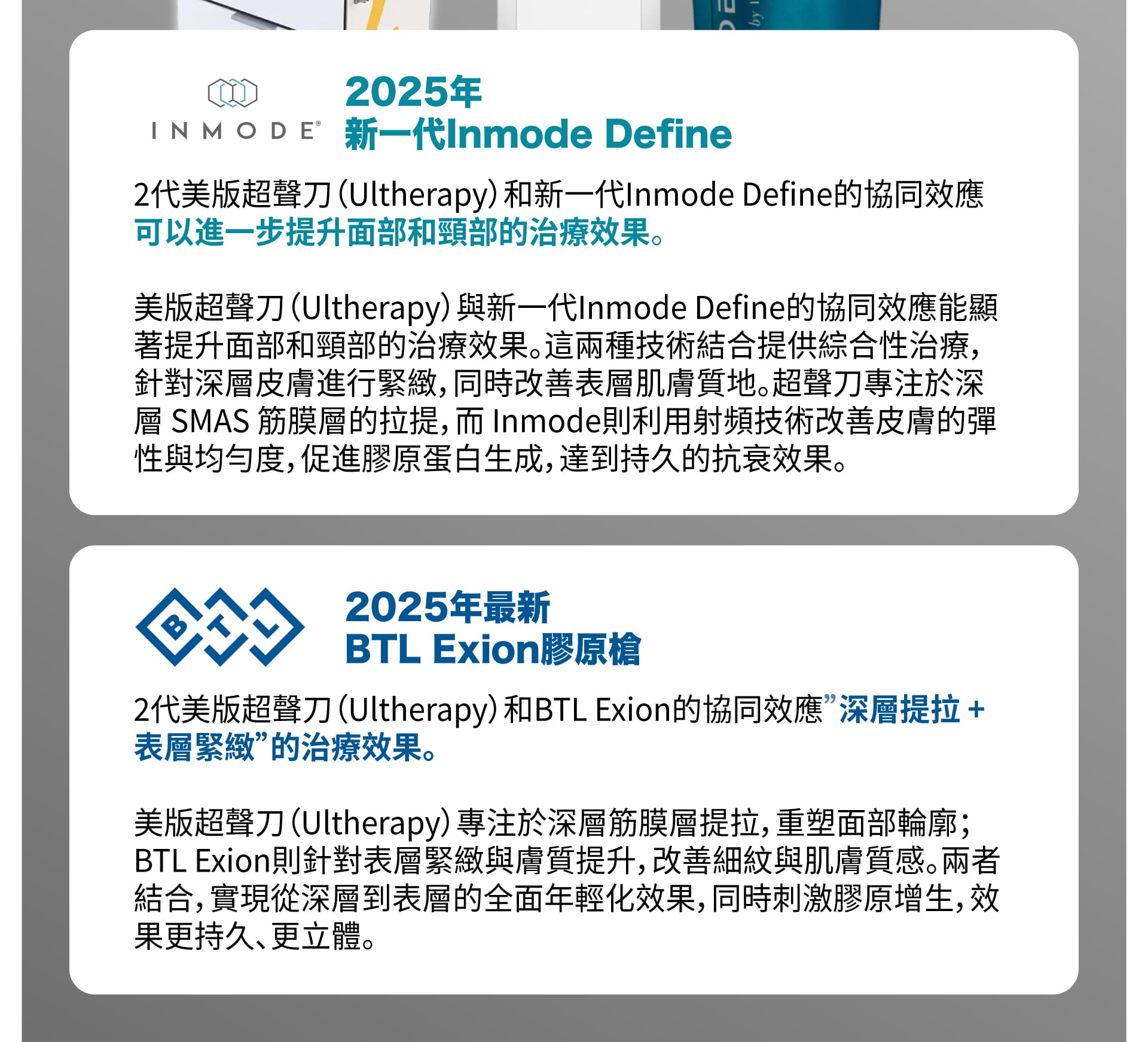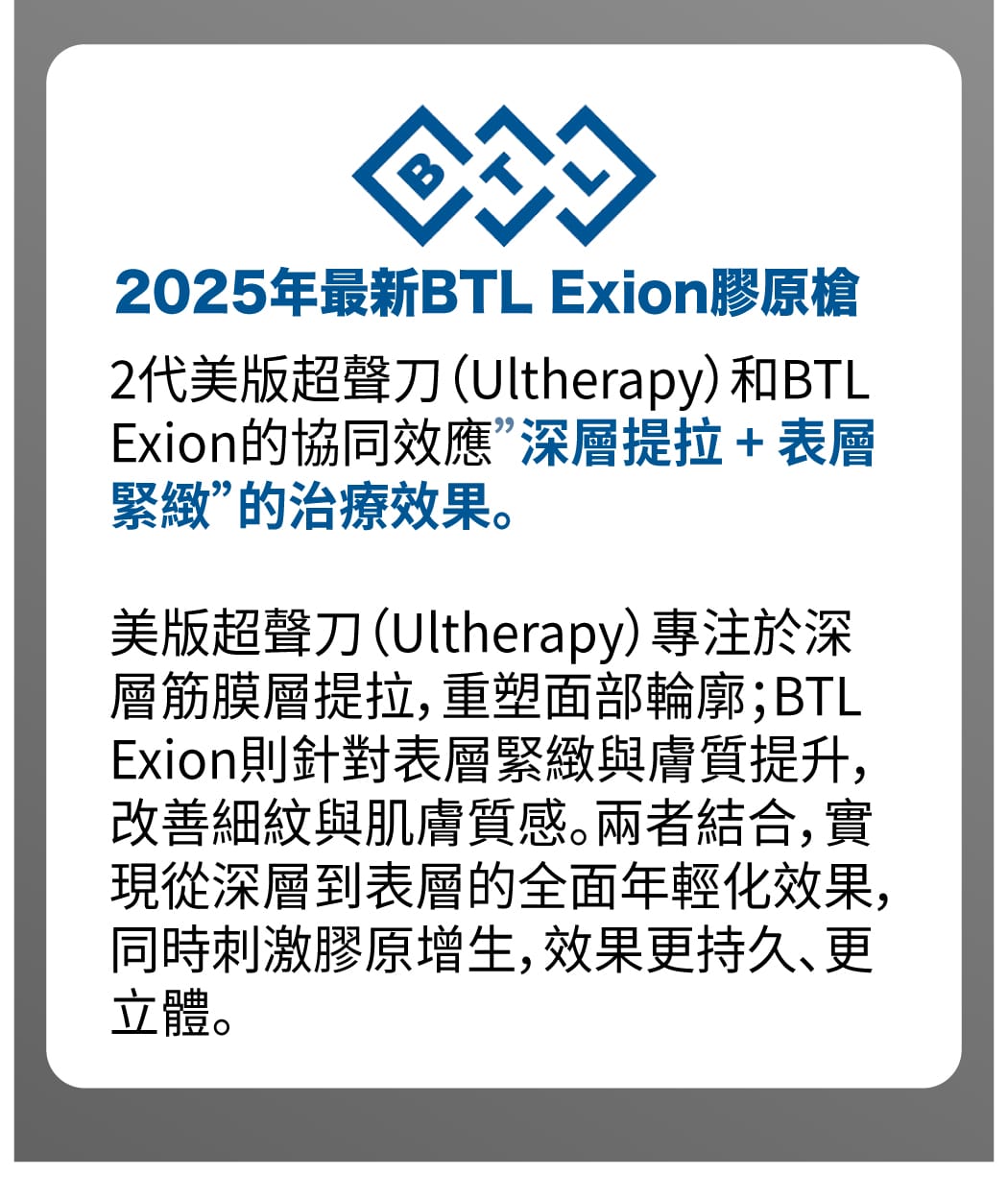 美版超聲刀(Ultherapy)與 BTL Exion 的協同效應: - 深層提拉 + 表層緊緻: Ulthera 負責深層的筋膜層提拉,而 BTL Exion 則針對表層膚質進行細緻化改善,兩者搭配可讓肌膚從內到外更緊緻。