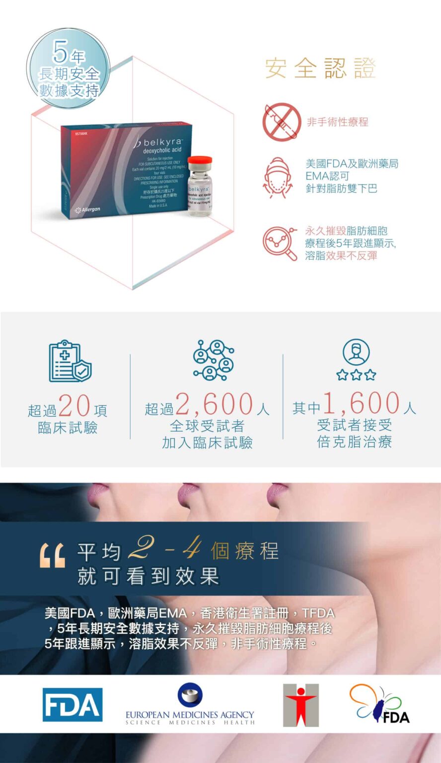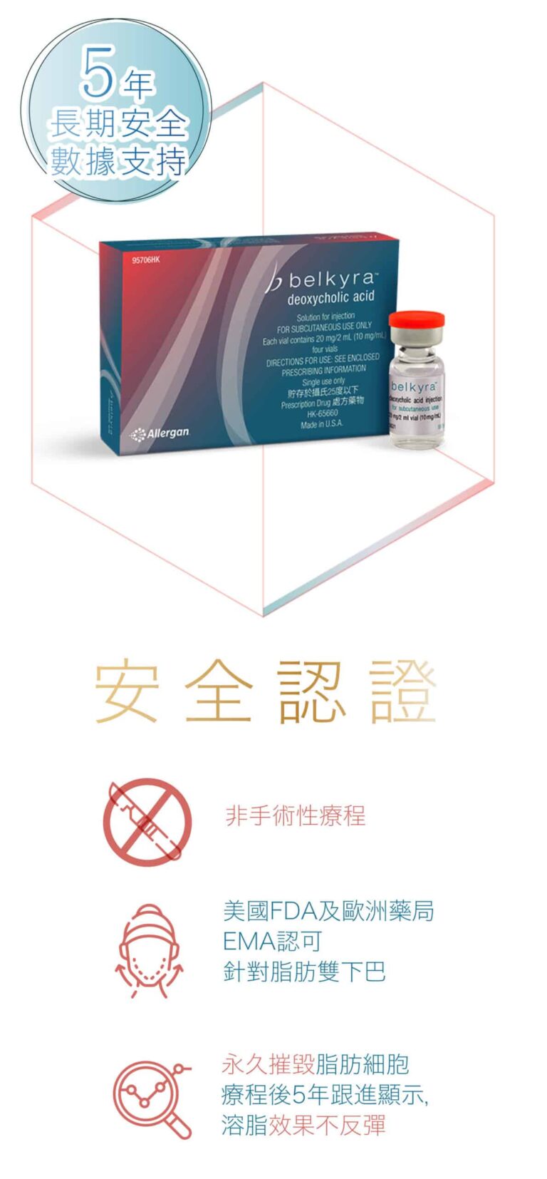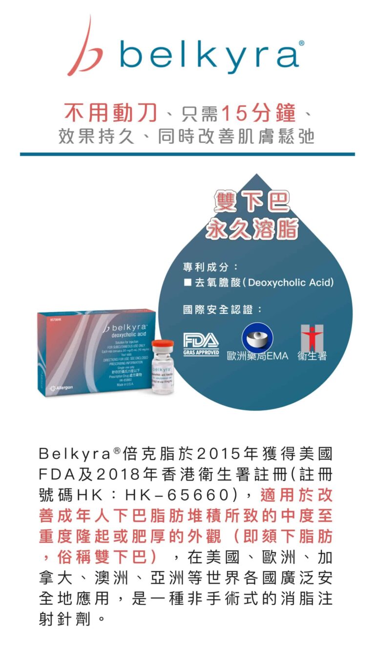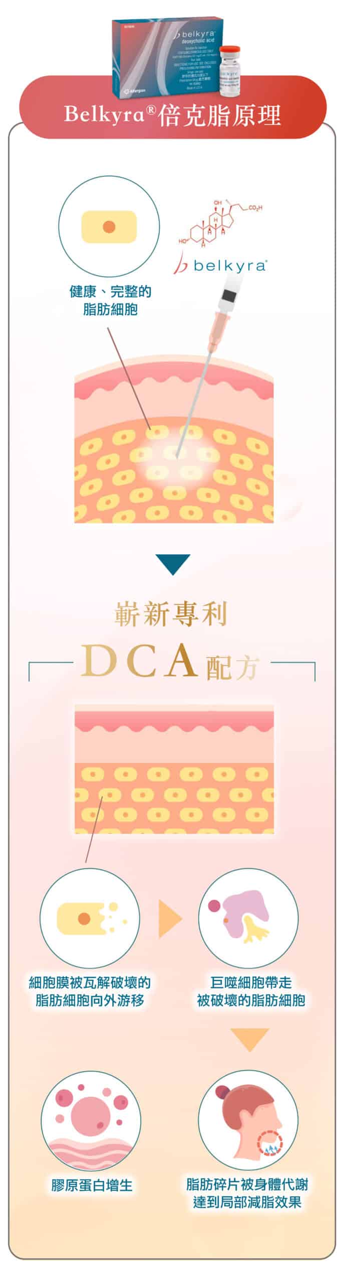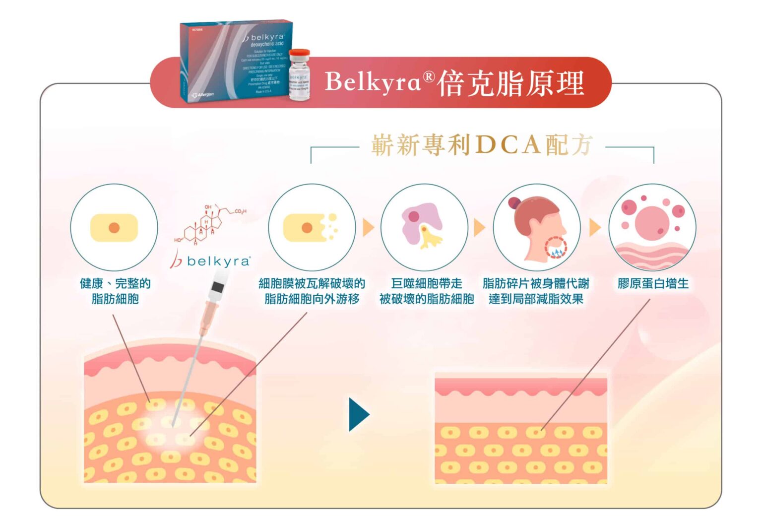 它是一種醫生處方用藥,注射液內含有「去氧膽酸Deoxycholic Acid」屬於一種細胞溶解藥物。當倍克脂被注射至頷下皮下脂肪層後,利用去氧膽酸的可破壞脂肪細胞特性,造成細胞膜的物理性破壞,進而促使脂肪細胞溶解後,再透過人體自然的代謝作用,將被破壞後的脂肪細胞排出體外,以達到減少脂肪細胞數量的目的。原廠臨床試驗中不僅通過20項以上的檢測、大於2600人的親身參與、超過5年以上的長期追蹤,多方數據都顯示 Belkyra®倍克脂是一種高度安全與效果顯著的消脂療程。