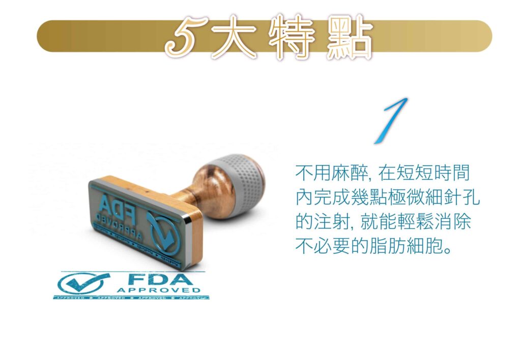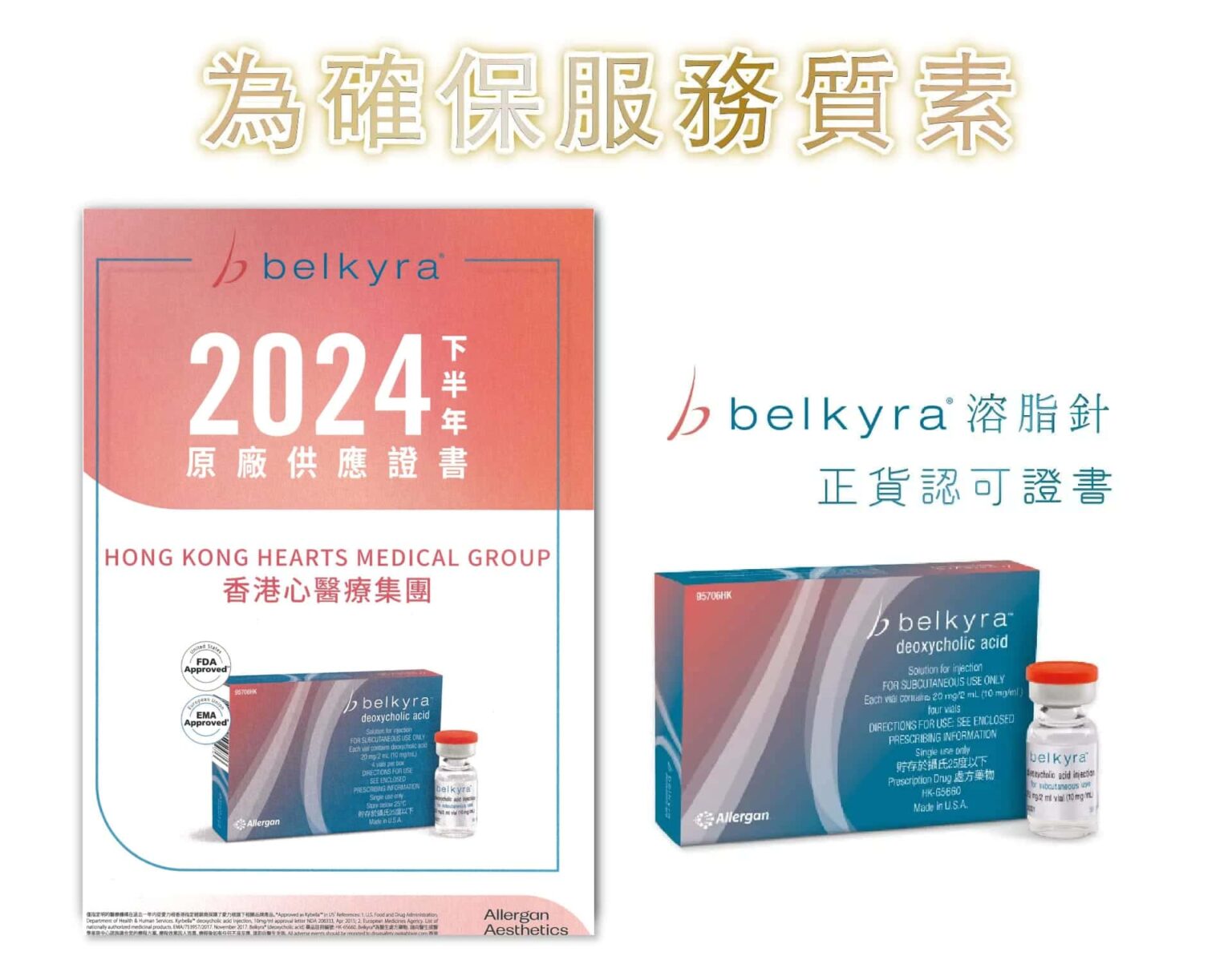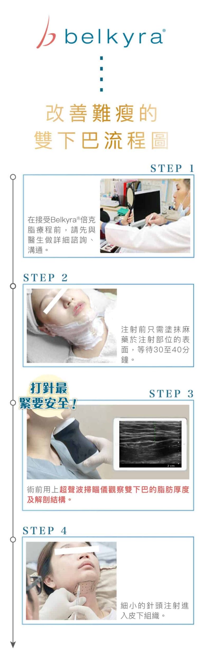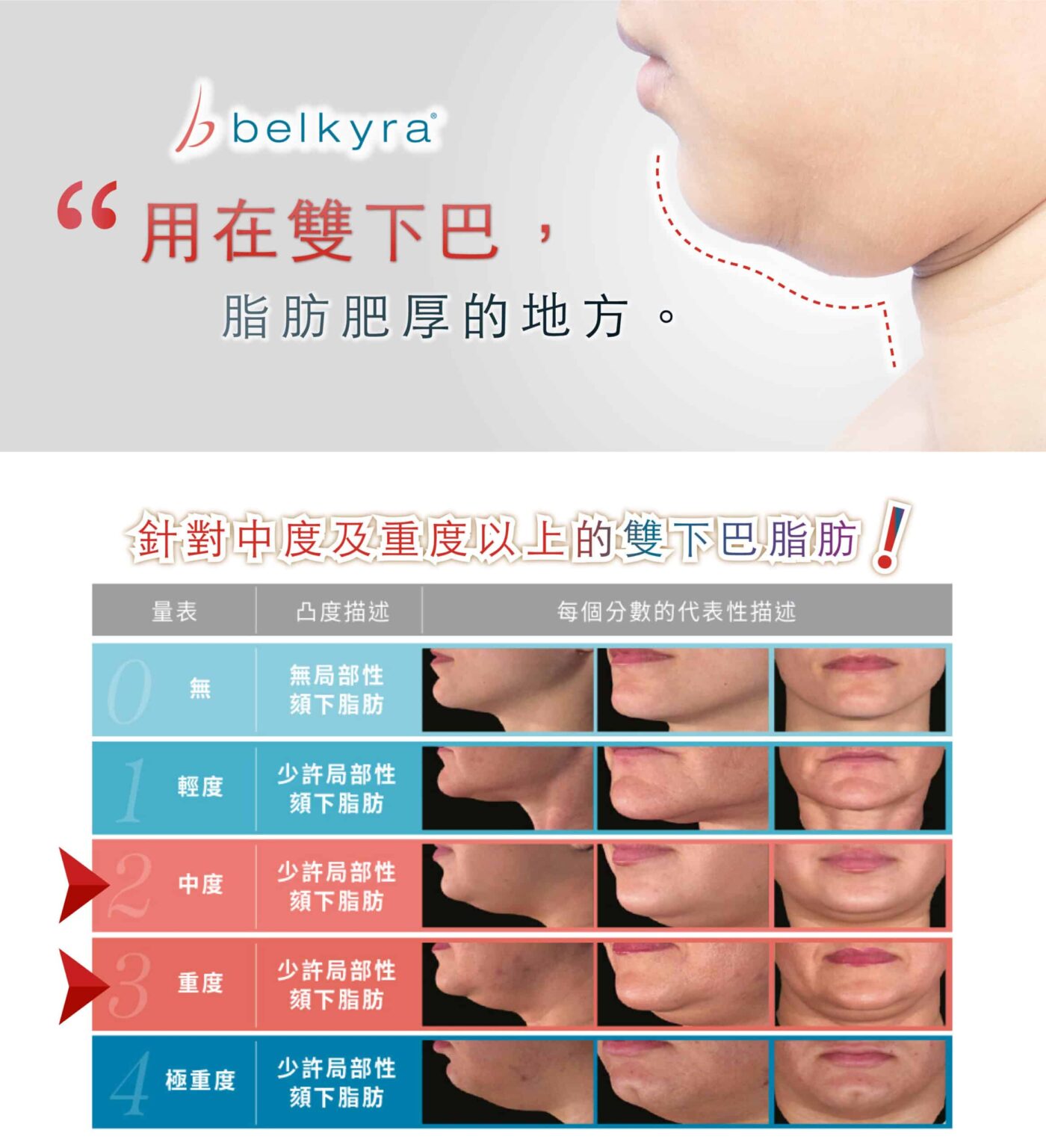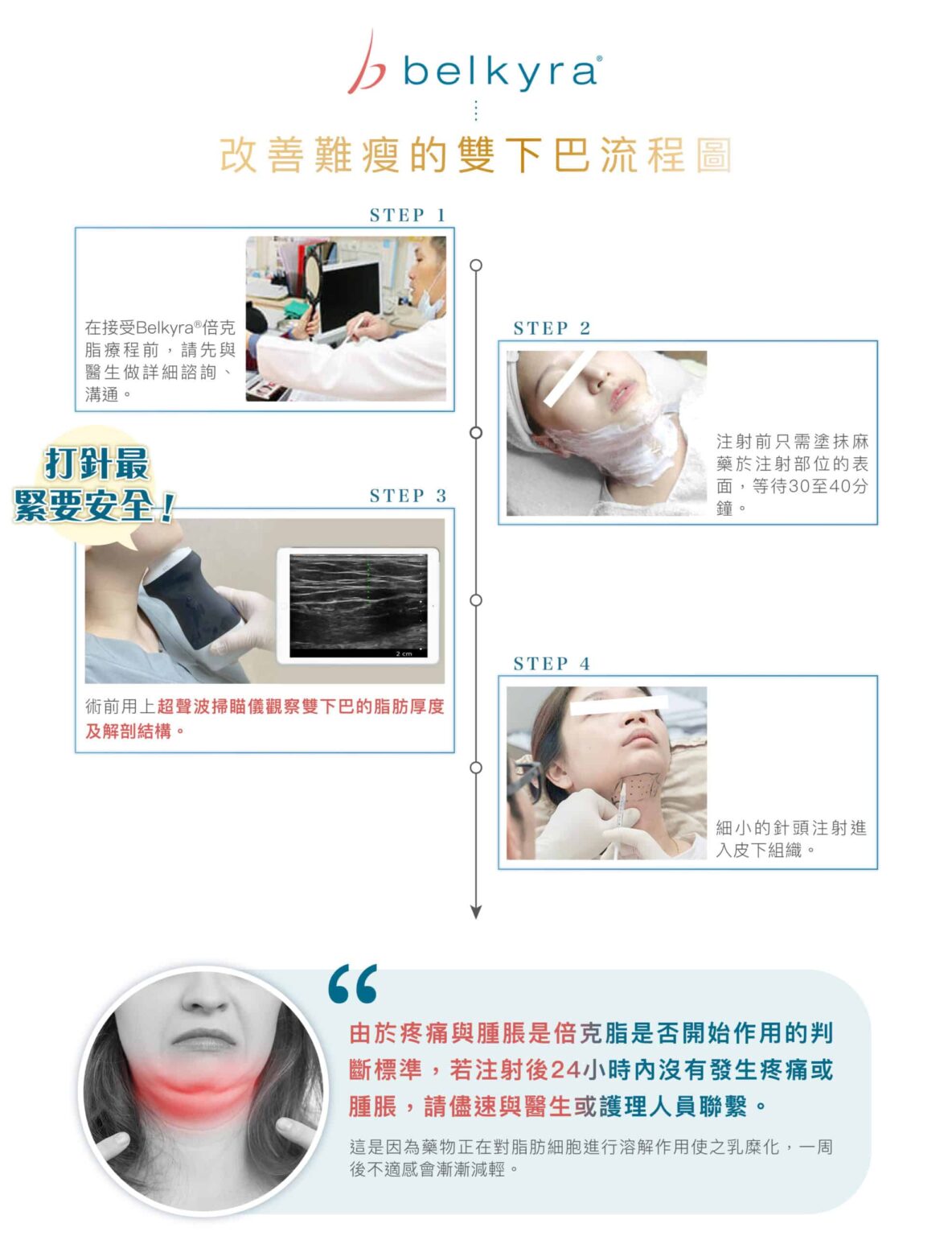 它是一種醫生處方用藥,注射液內含有「去氧膽酸Deoxycholic Acid」屬於一種細胞溶解藥物。當倍克脂被注射至頷下皮下脂肪層後,利用去氧膽酸的可破壞脂肪細胞特性,造成細胞膜的物理性破壞,進而促使脂肪細胞溶解後,再透過人體自然的代謝作用,將被破壞後的脂肪細胞排出體外,以達到減少脂肪細胞數量的目的。原廠臨床試驗中不僅通過20項以上的檢測、大於2600人的親身參與、超過5年以上的長期追蹤,多方數據都顯示 Belkyra®倍克脂是一種高度安全與效果顯著的消脂療程。