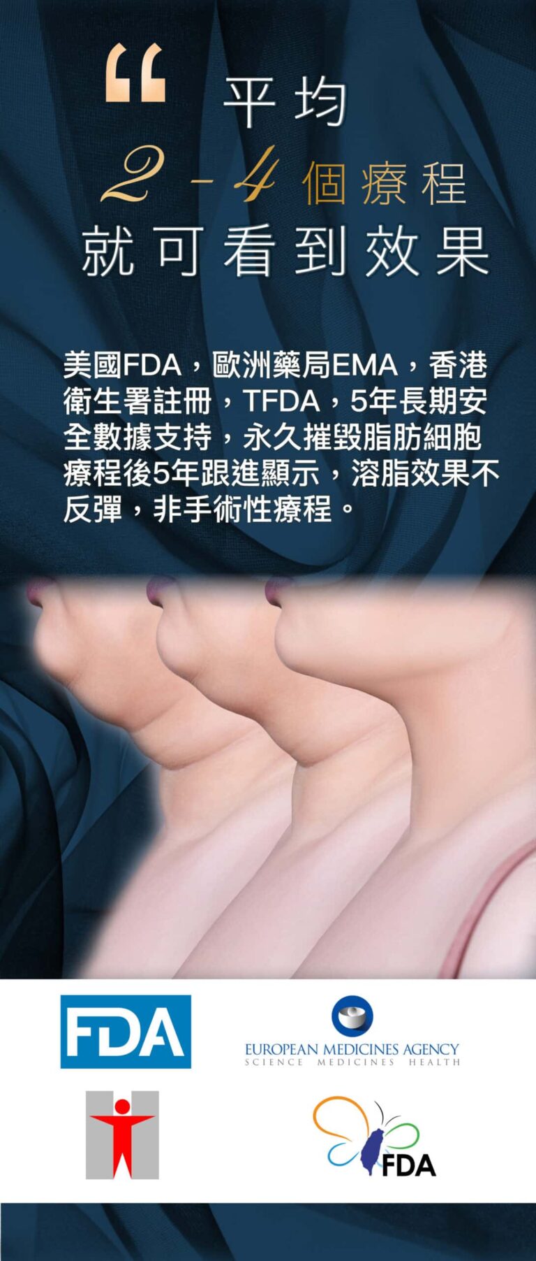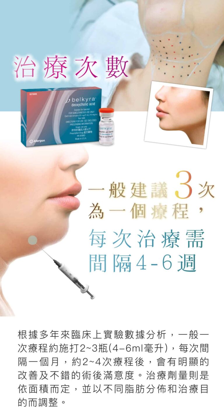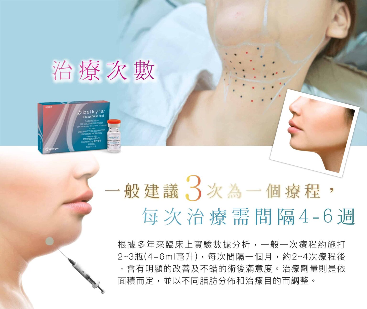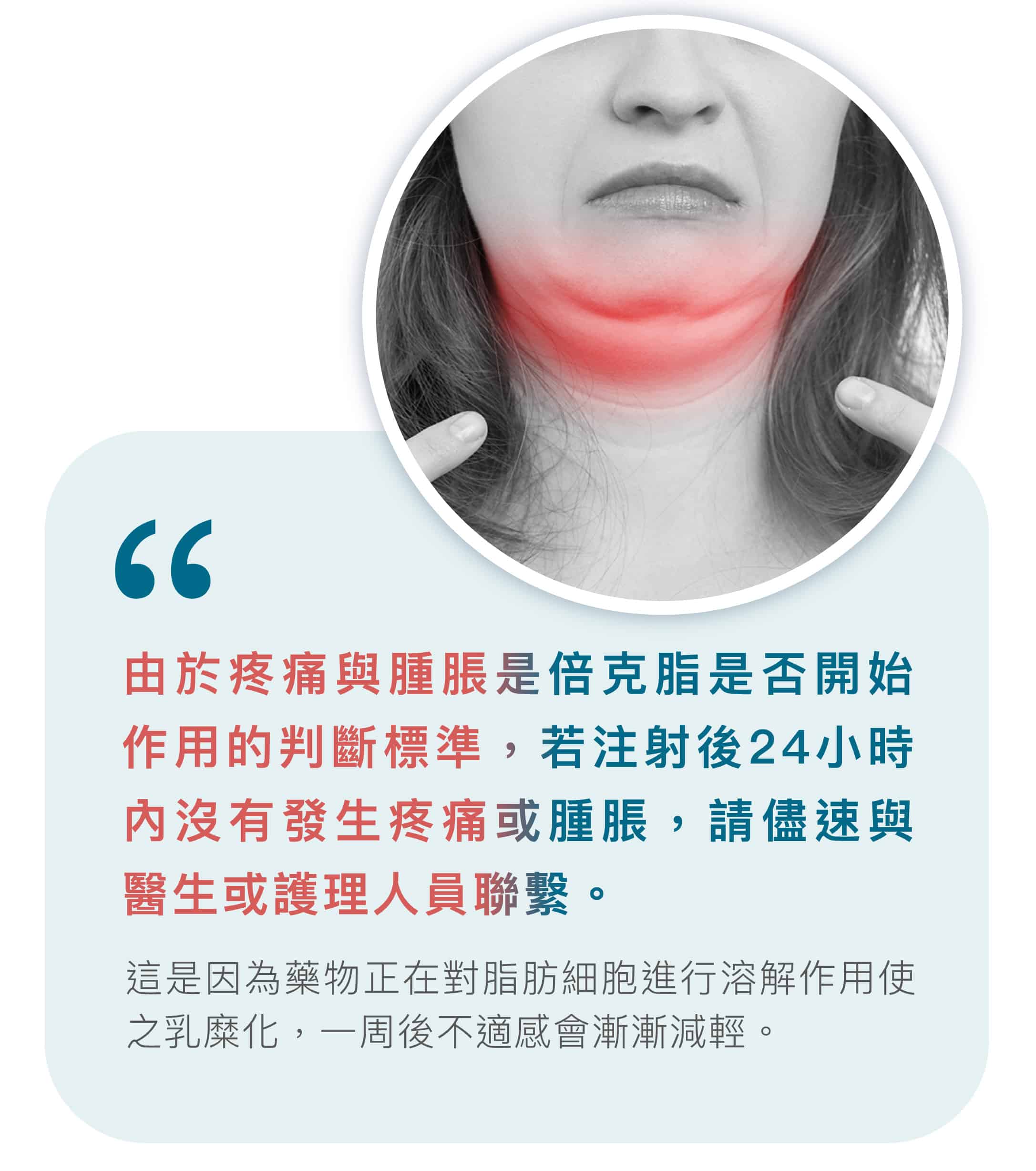 注射後不會立即見效。且於施打完24小時內,施針部位可能會腫脹,或者出現瘀血點、發癢等症狀,這是因為藥物正在對脂肪細胞與微粒進行溶解作用,因此會引發皮下組織出現發炎反應。術後約一週內,會產生輕微紅腫、癢、脹痛等副作用,甚至可能出現皮下硬塊或皮膚麻癢。按照經驗來說,恢復期大約是4-8週。一般而言,施打2至4次、每次間隔一個月,才能達到顯著效果。