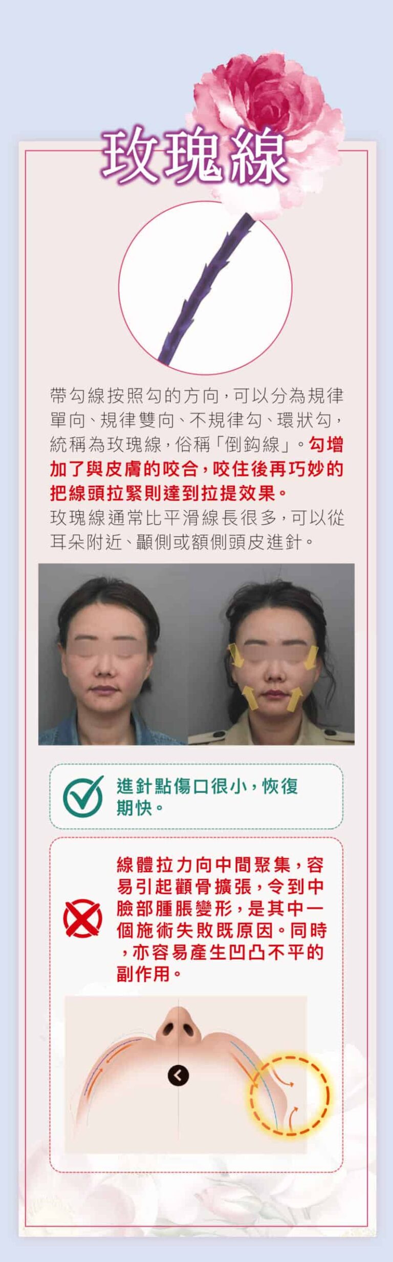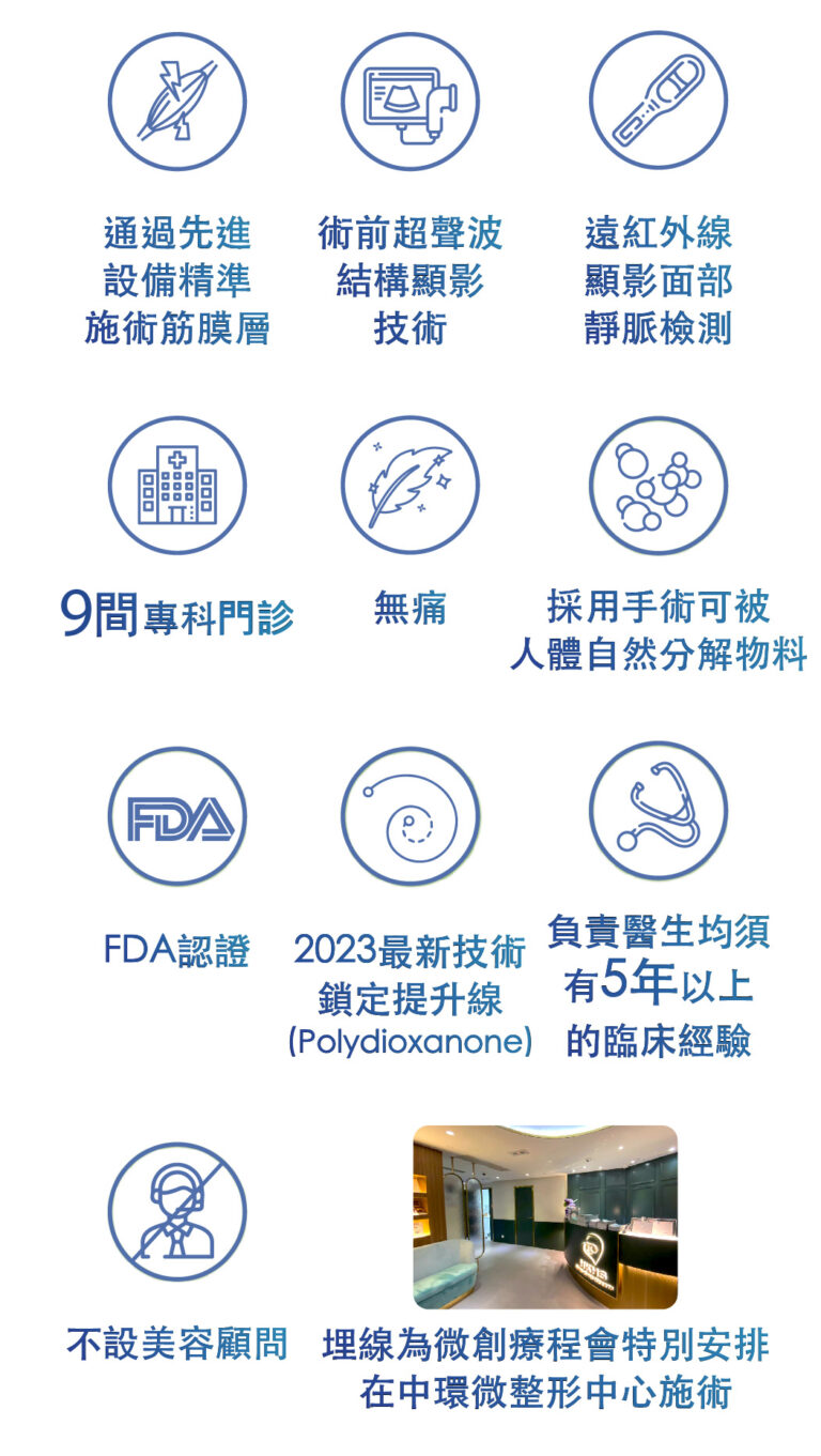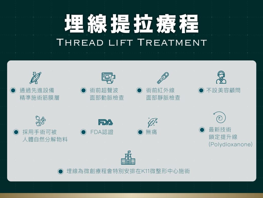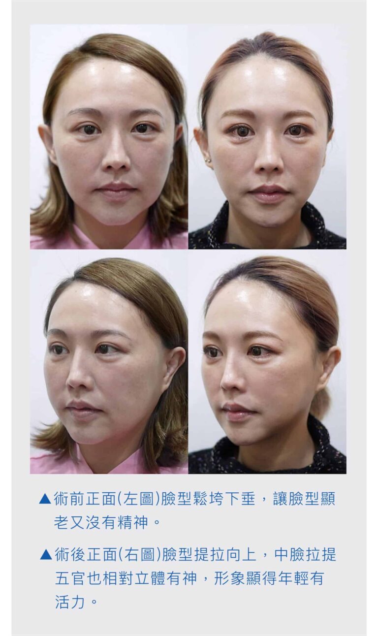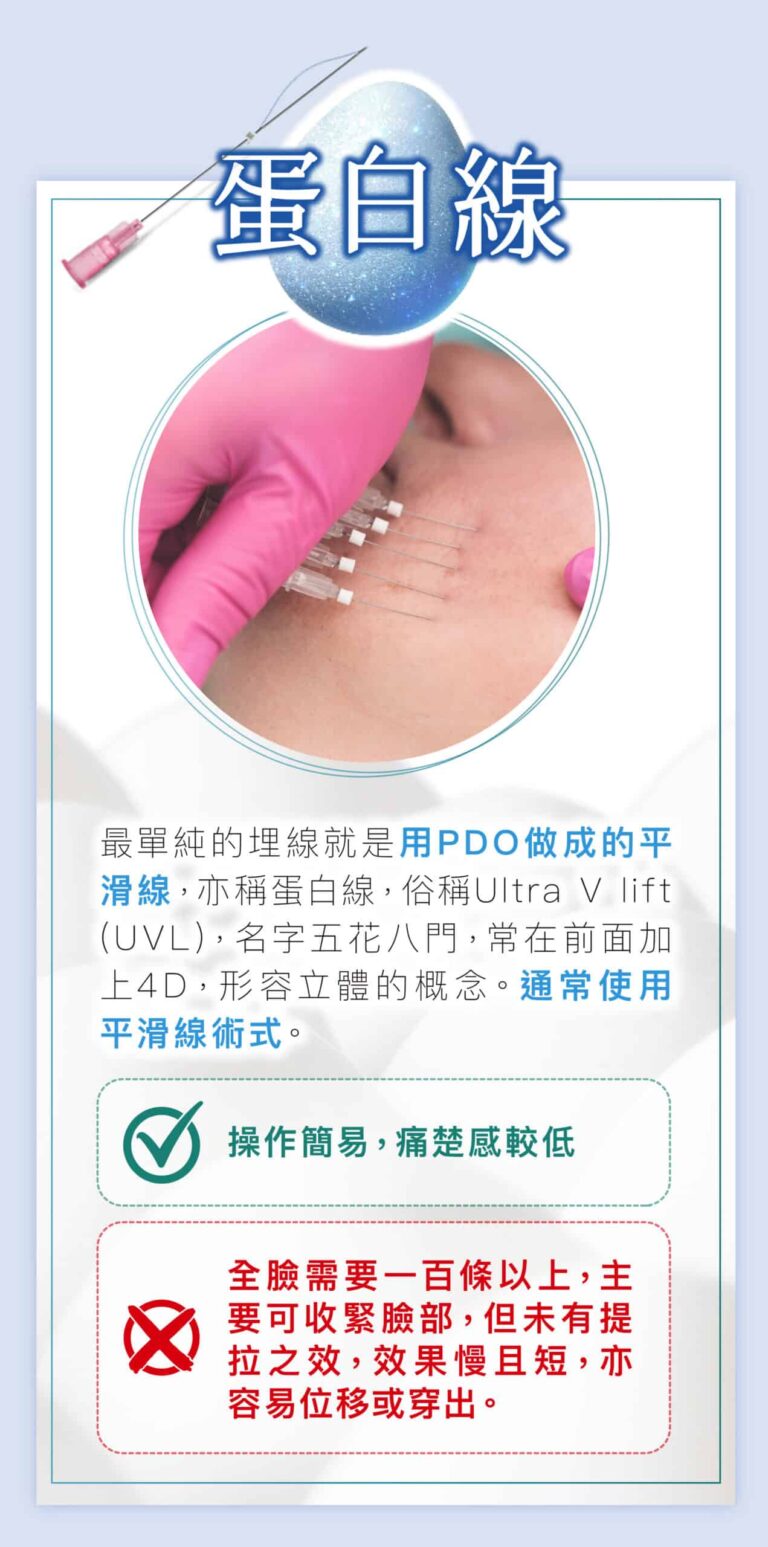 在手術期間使用新式無痛微創局部麻醉療程,埋線拉皮過程中不會有太大的痛楚,術後臉部只會有輕微腫脹感覺,術後當日可以正常工作生活聚會。 埋線療程植入的縫線,剛開始肌膚可能會有緊繃感及異物感,但不影響日常生活作息,治療部位可能會有些微的陣痛感,縫線植入處會有機會瘀青等情況發生,約數天後會逐漸消退,時間較長的為7至10日。