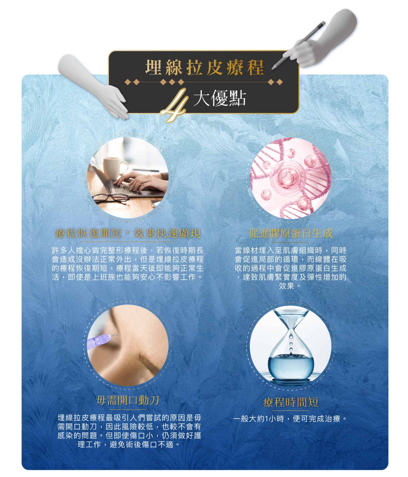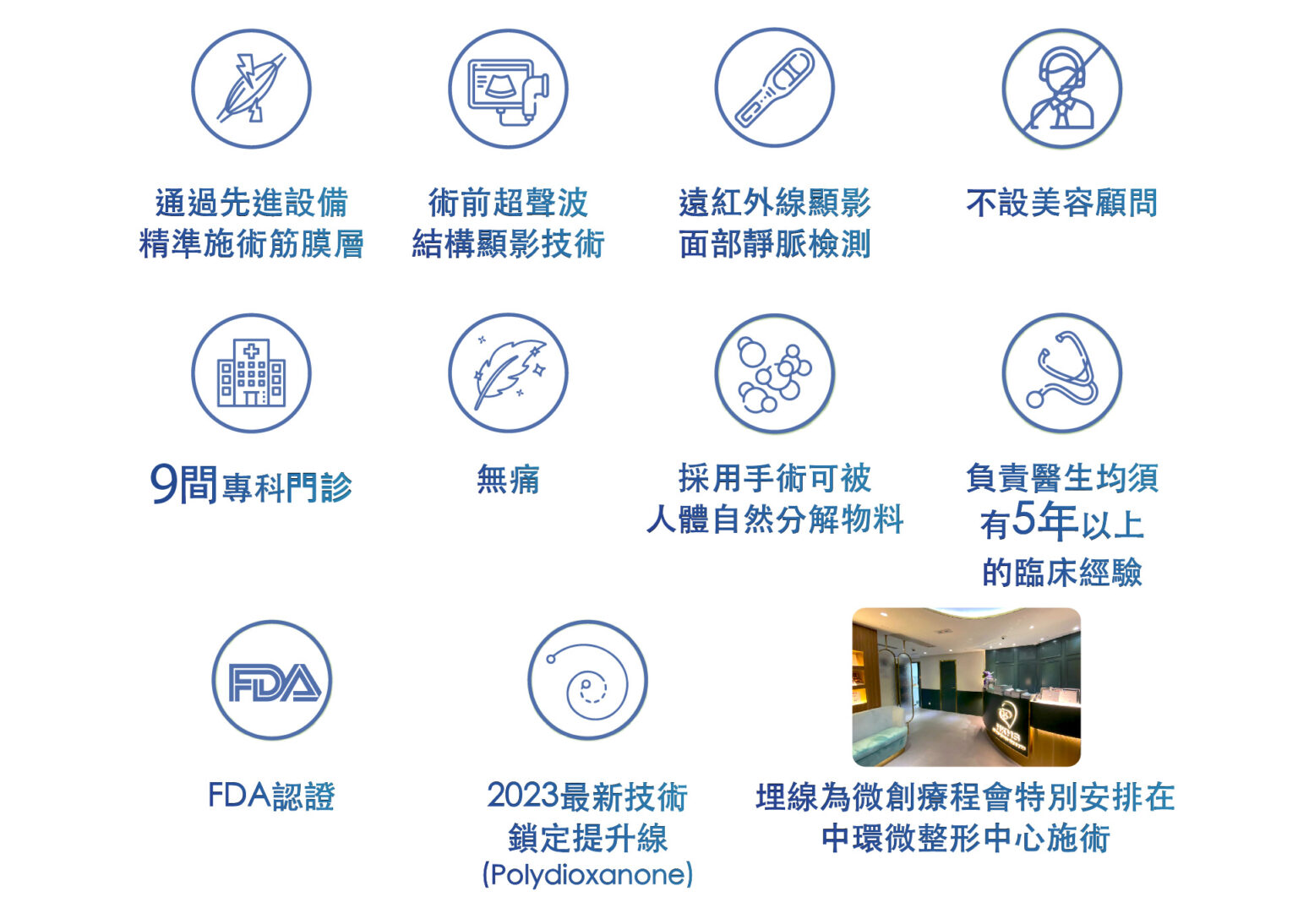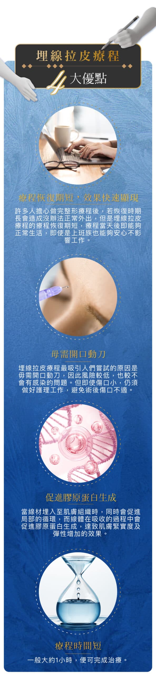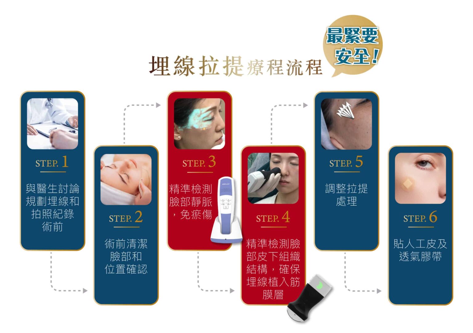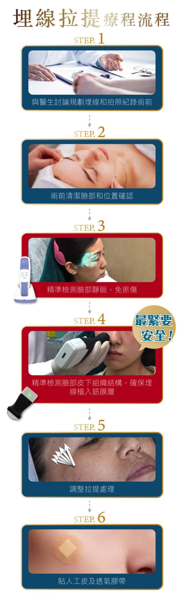 在手術期間使用新式無痛微創局部麻醉療程,埋線拉皮過程中不會有太大的痛楚,術後臉部只會有輕微腫脹感覺,術後當日可以正常工作生活聚會。 埋線療程植入的縫線,剛開始肌膚可能會有緊繃感及異物感,但不影響日常生活作息,治療部位可能會有些微的陣痛感,縫線植入處會有機會瘀青等情況發生,約數天後會逐漸消退,時間較長的為7至10日。