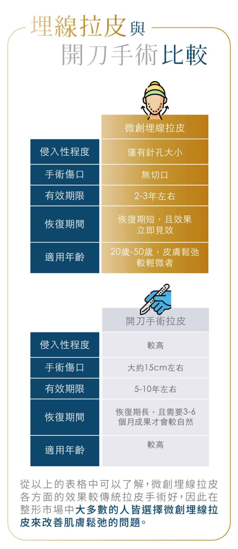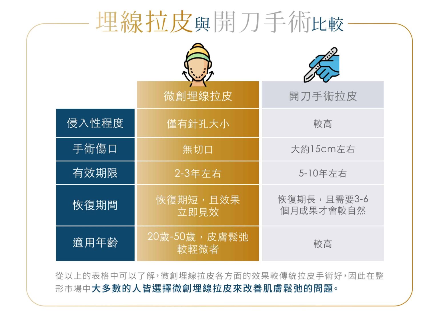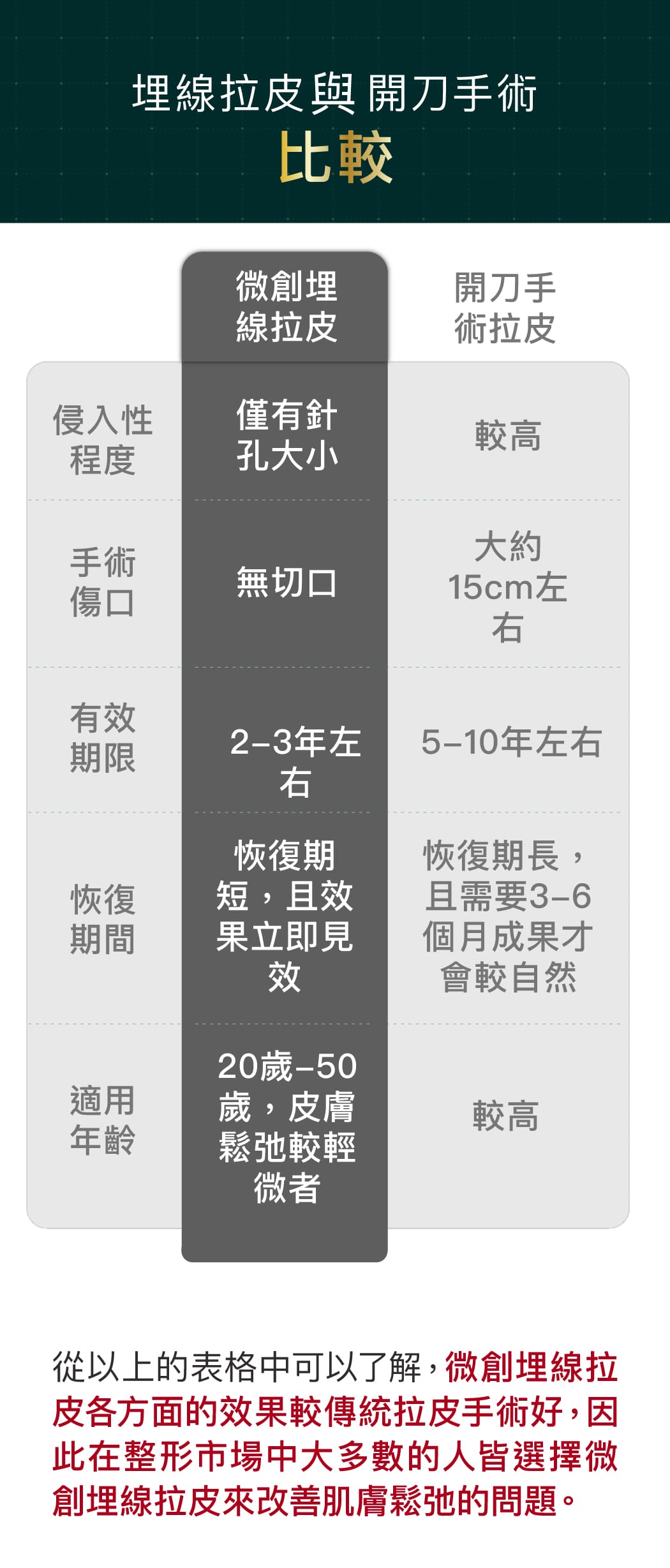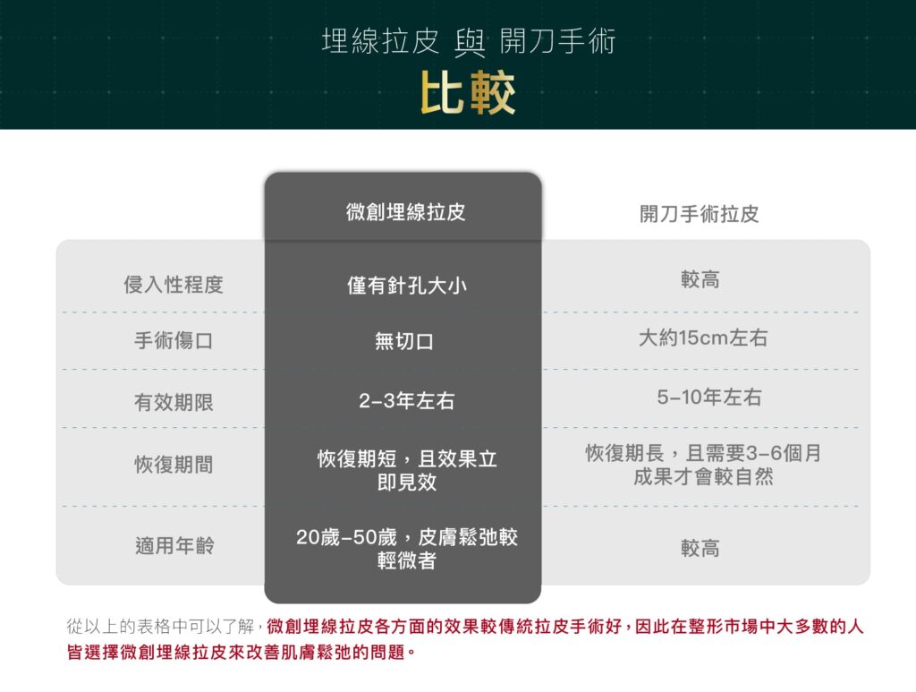 埋線拉皮為微創手術,使用的針頭極細,線材為外科使用之可吸收縫線,因此傷口僅針孔大小,術後約三十分鐘針孔即癒合,術後腫脹約 1至2 天,瘀青則約3至5天消退,不會留下疤痕。