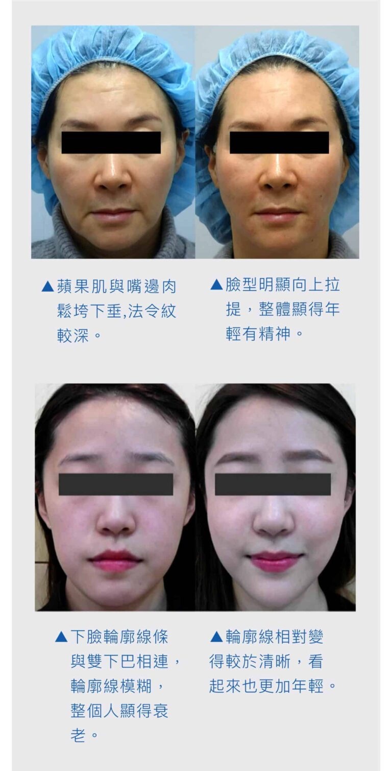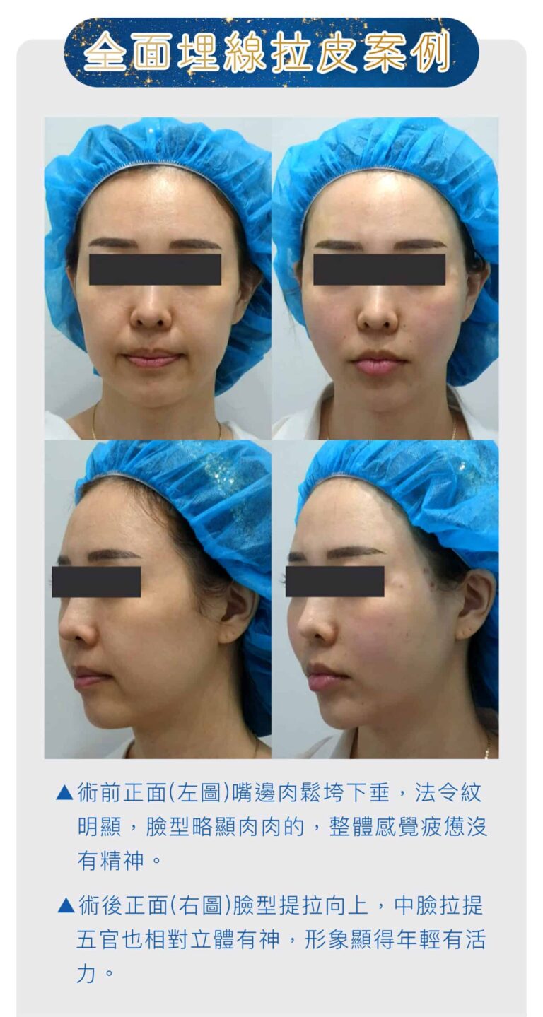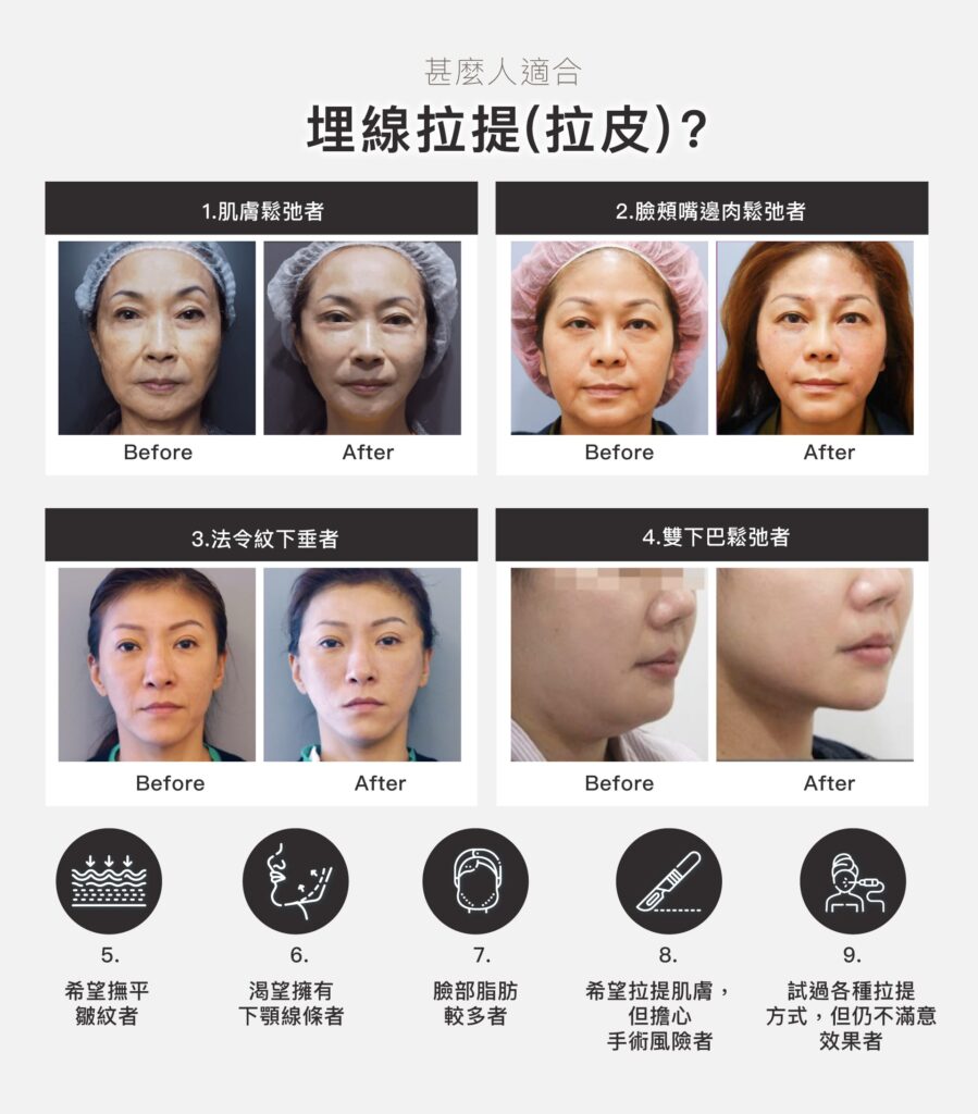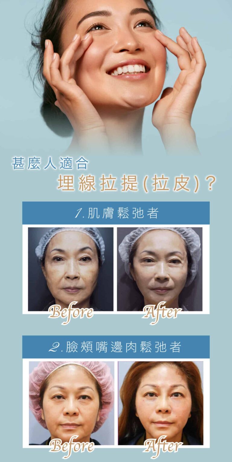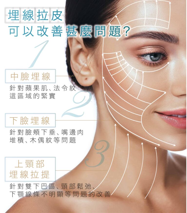 埋線拉皮大部份運用在臉部的拉皮、改善鼻型,還可以運用在提胸、提臀,皆有很好的拉皮效果。針對臉部輪廓、肌膚鬆弛、皺紋等改善,建議療程前一定要經由醫生詳細的評估,從而得到較為準確及顯著的效果。