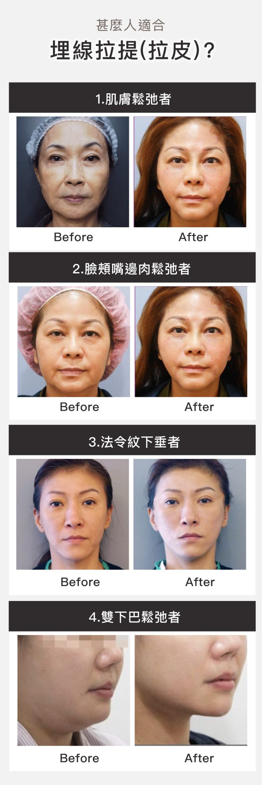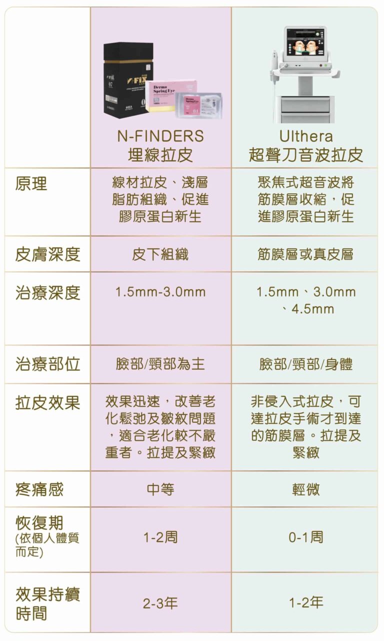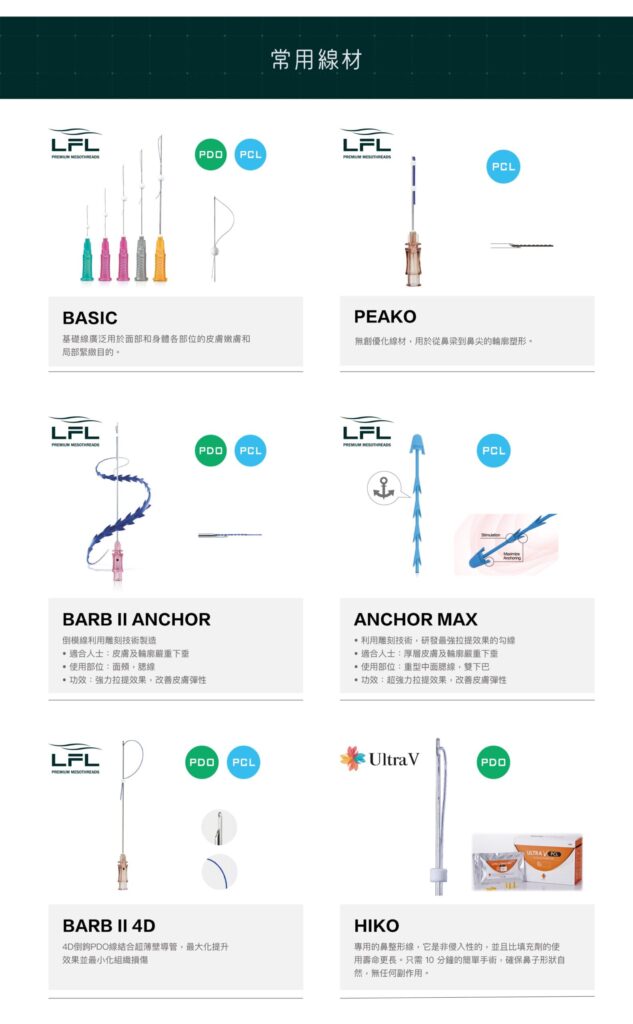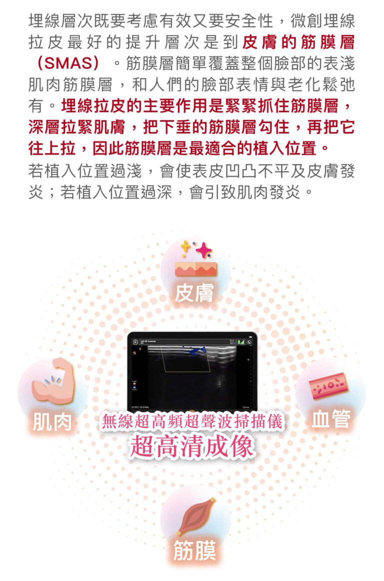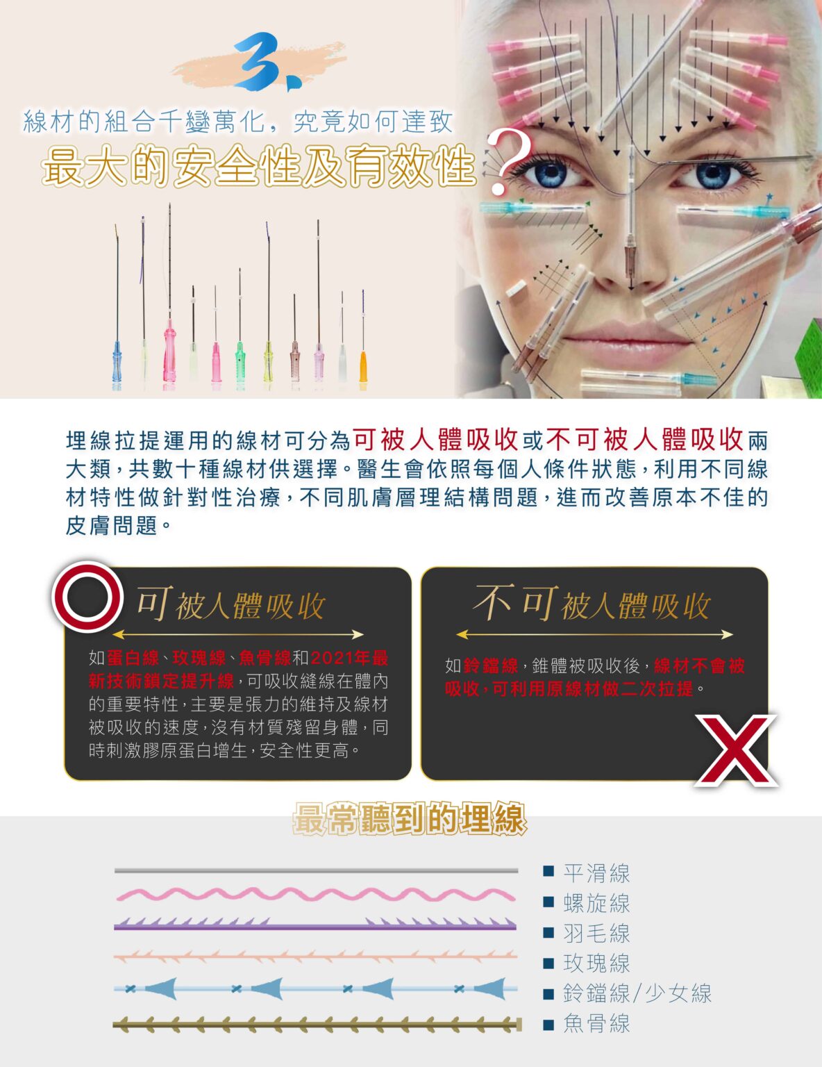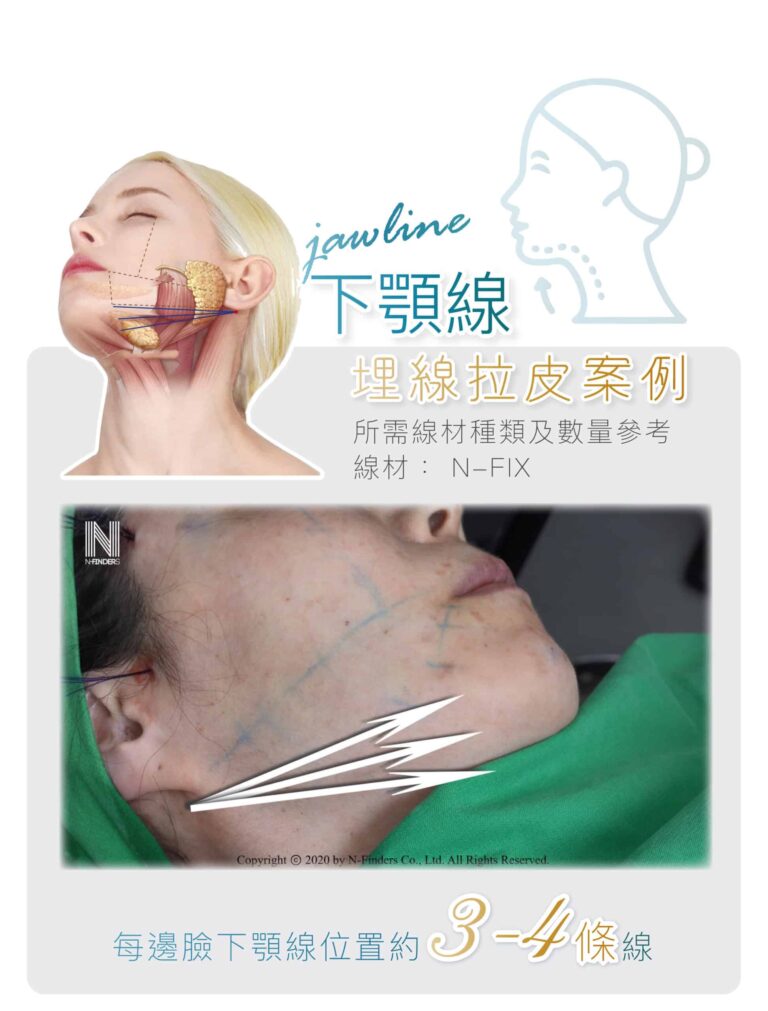 埋線拉皮大部份運用在臉部的拉皮、改善鼻型,還可以運用在提胸、提臀,皆有很好的拉皮效果。針對臉部輪廓、肌膚鬆弛、皺紋等改善,建議療程前一定要經由醫生詳細的評估,從而得到較為準確及顯著的效果。