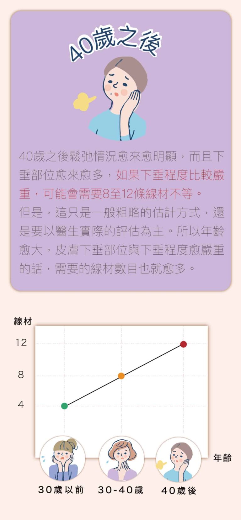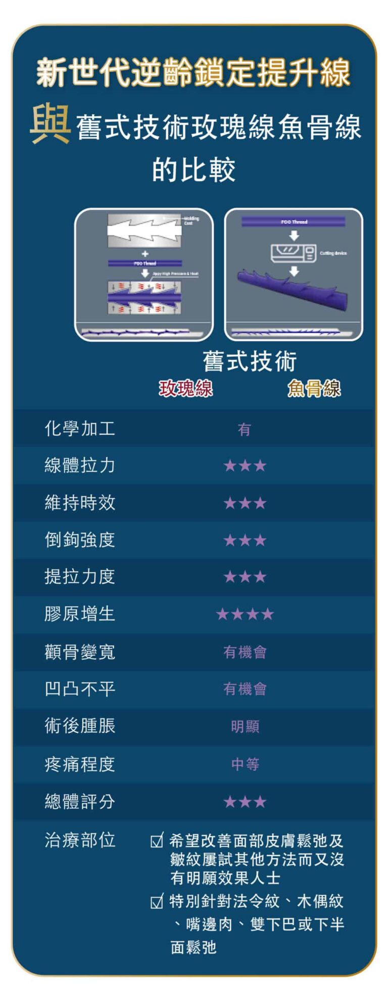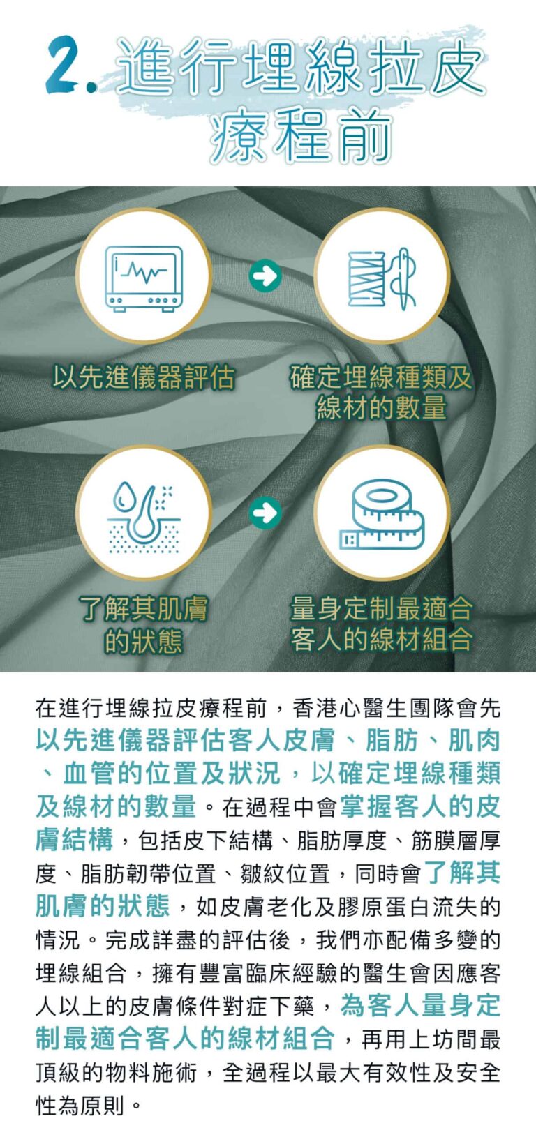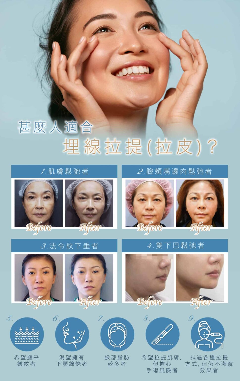 埋線拉皮大部份運用在臉部的拉皮、改善鼻型,還可以運用在提胸、提臀,皆有很好的拉皮效果。針對臉部輪廓、肌膚鬆弛、皺紋等改善,建議療程前一定要經由醫生詳細的評估,從而得到較為準確及顯著的效果。