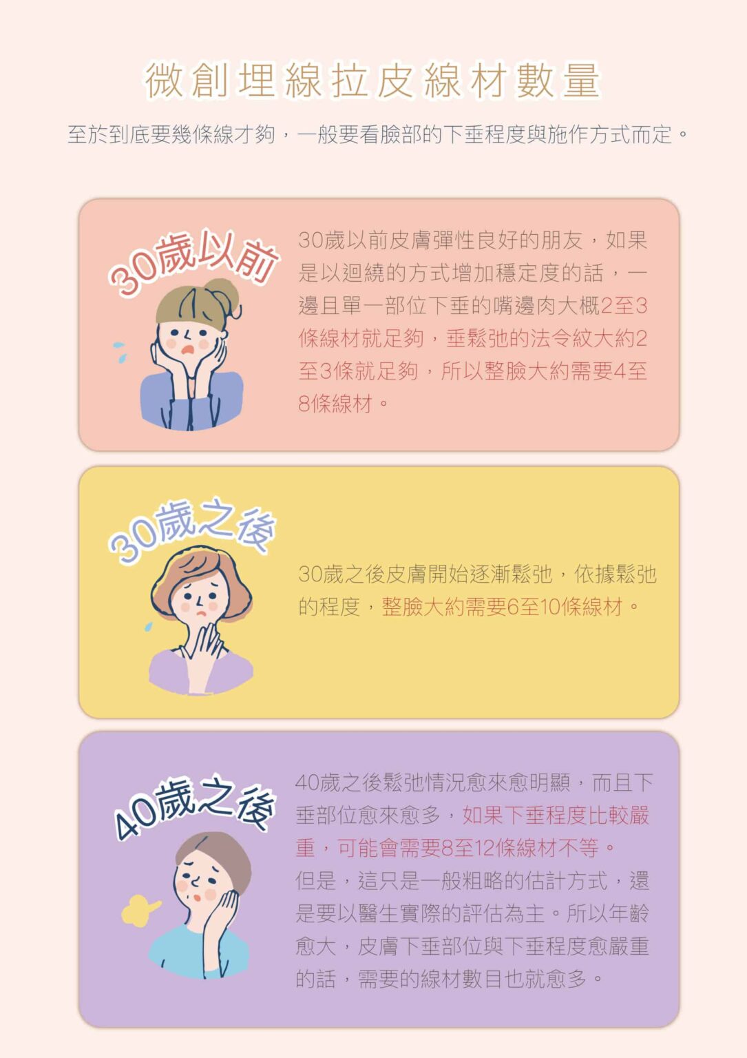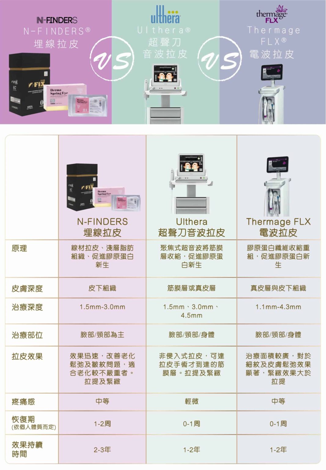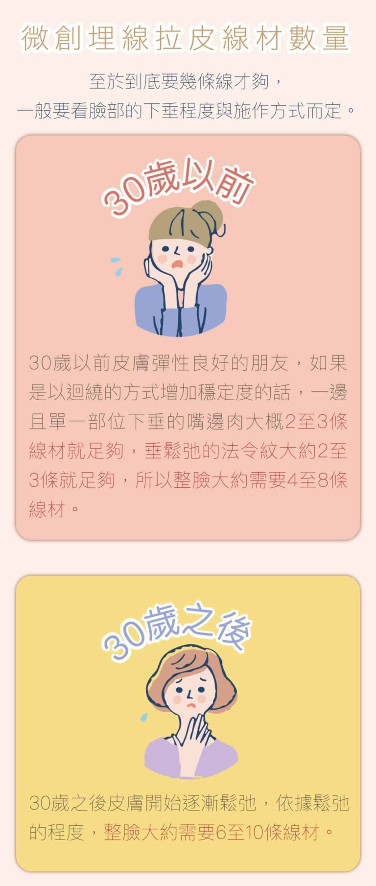 需視接受治療者情況而定,如年紀、皮膚下垂鬆弛程度及線材量都會有所不同,依醫生經驗,療程效果大約為維持2至3年,療程次數基本上一次即可見到效果,若希望維持皮膚緊度,建議一年可以接受2次療程,若老化程度較為嚴重者,建議可與醫生討論結合其他治療方式。